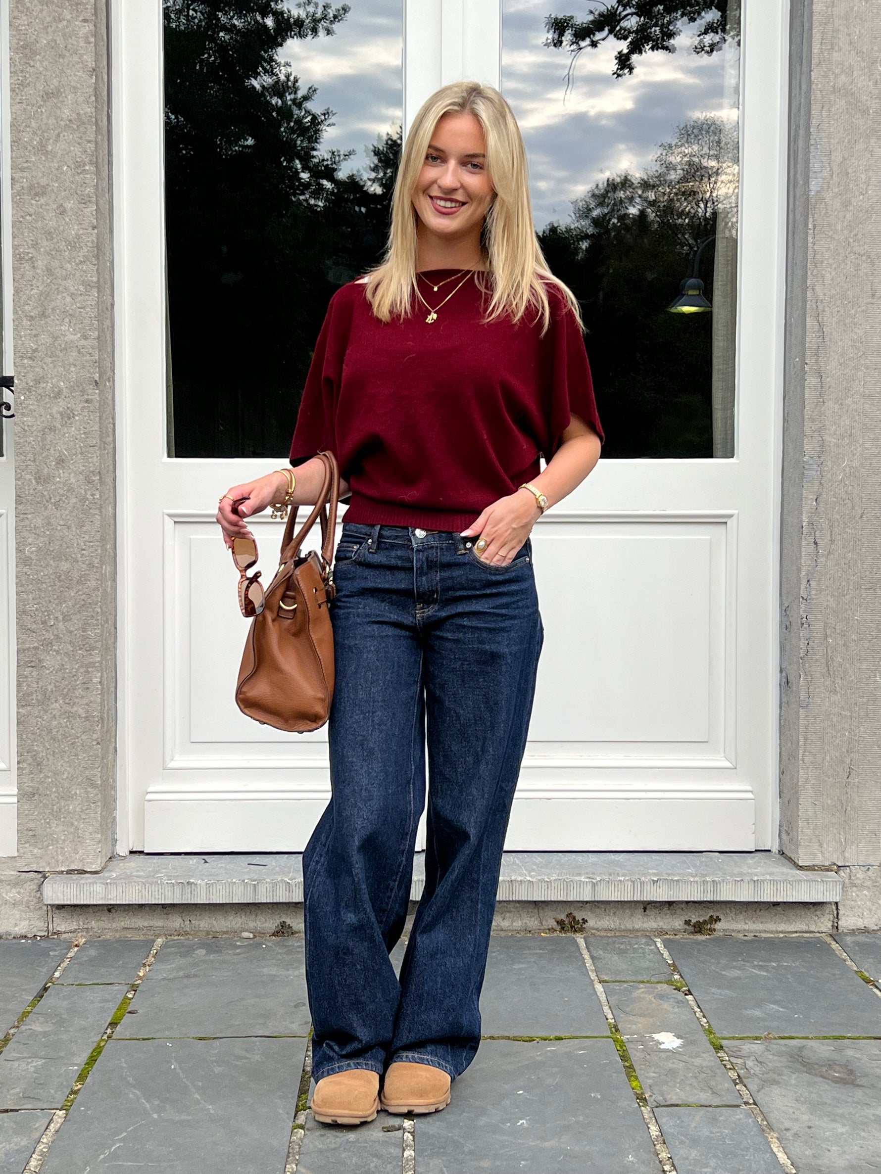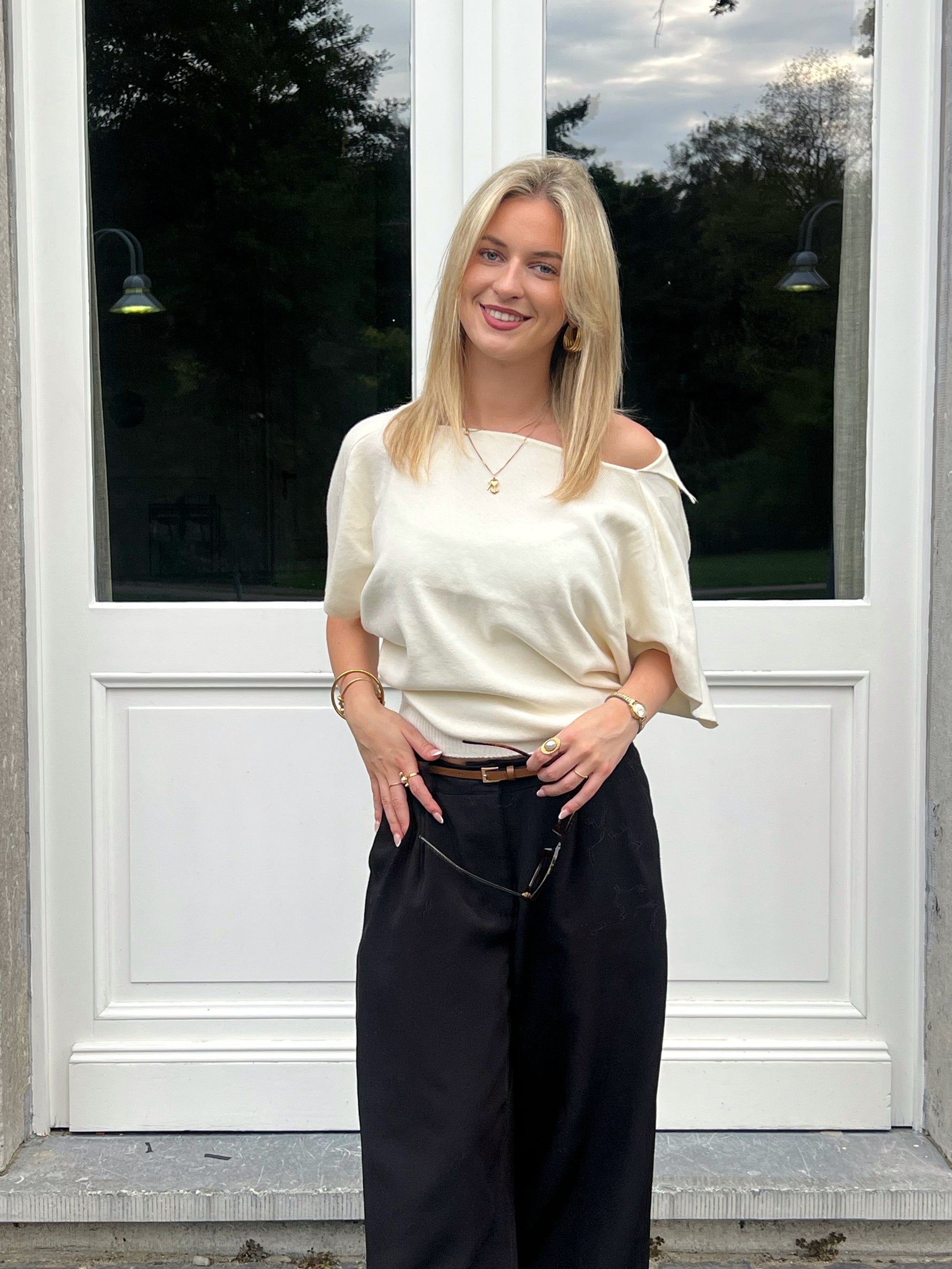 De Eva Sweater is een elegante trui met een vrouwelijke twist. Het off-shoulder ontwerp geeft een speelse en stijlvolle uitstraling, terwijl de rechte pasvorm en korte mouwen zorgen voor een moderne look. Ideaal om zowel casual met jeans te dragen als chic te combineren met een rok of pantalon. Een tijdloos item dat moeiteloos je garderobe aanvult.
