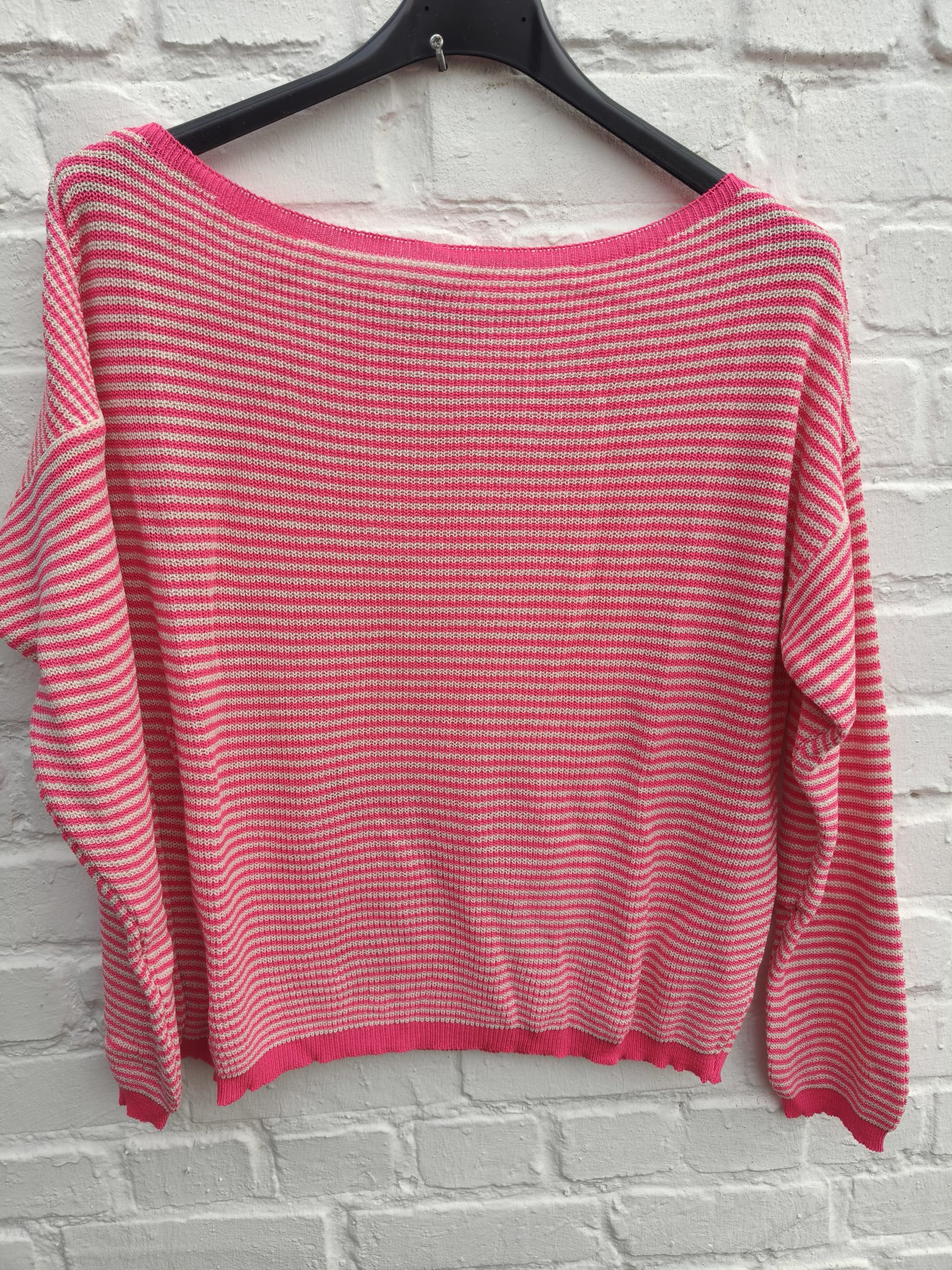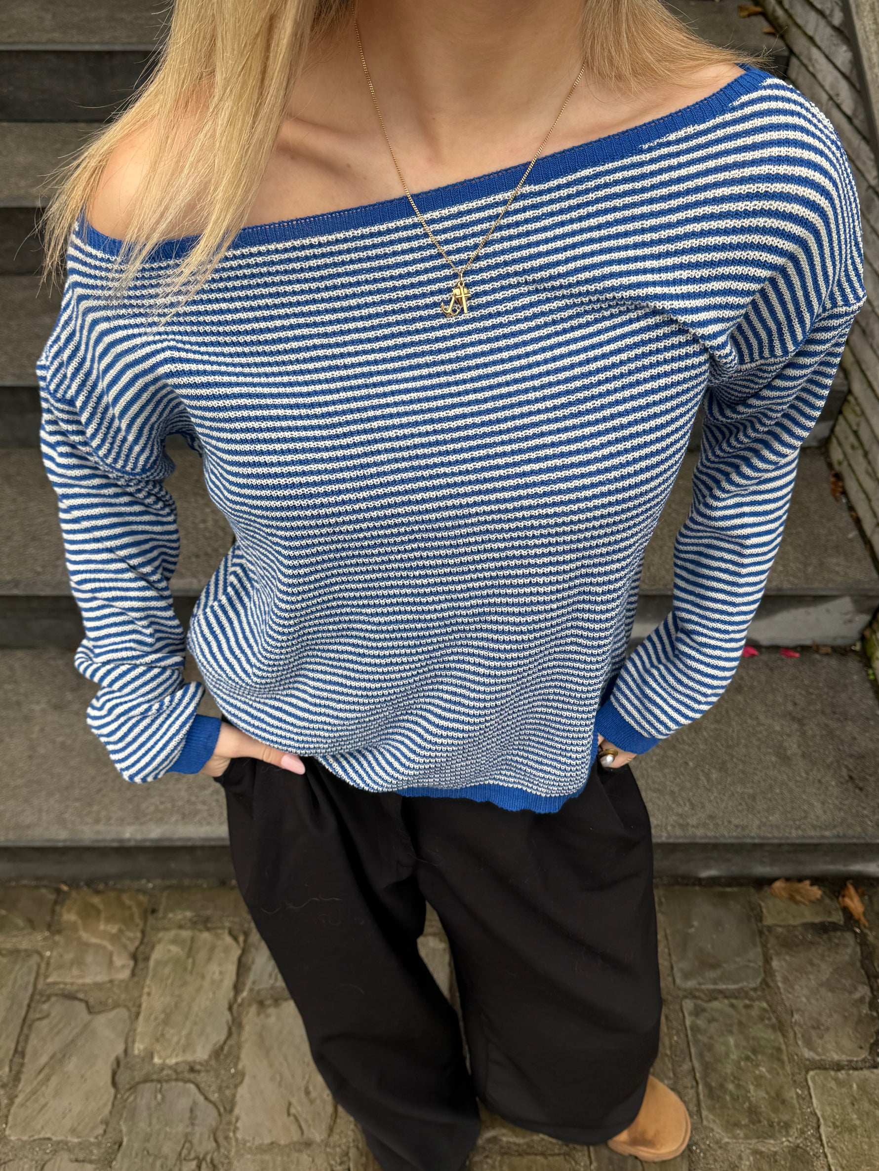 De Bo Sweater is een comfortabele trui met een speels streepjespatroon en een relaxte pasvorm. Met zijn zachte materiaal en off-shoulder look is hij ideaal voor zowel casual als stijlvolle outfits.