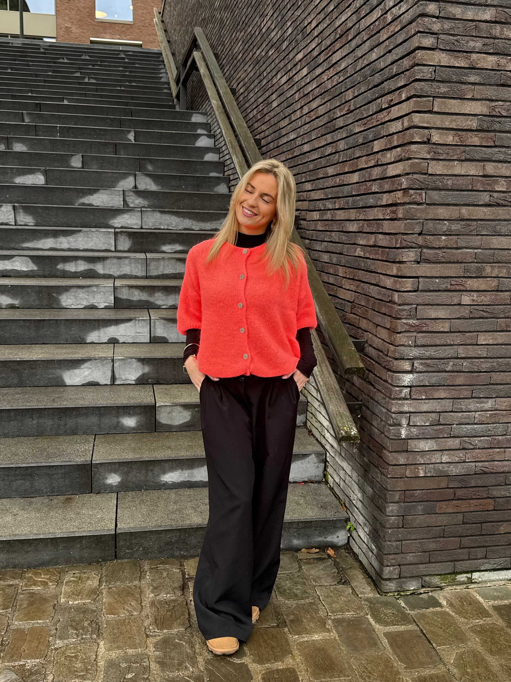 De Sunny Cardigan combineert comfort met een levendige, vrouwelijke uitstraling. Met korte mouwen, een zachte gebreide stof en elegante knopen is dit een veelzijdig stuk dat elke outfit opfleurt. Draag hem over een T-shirt of op zichzelf voor een cozy maar stijlvolle look.